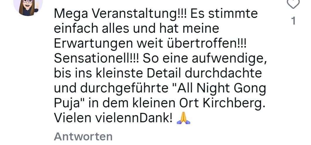 Eine ALL NIGHT GONG PUJA ist eine unvergessliche und unvergleichliche persönliche Reise durch Raum und Zeit in einer Nacht, die erfüllt ist von den differenzierten und vielschichtigen Klängen der Gongs und weiteren Klanginstrumenten. Es ist eine Zeremonie der Reinigung, Regeneration und Verjüngung, der für ein Wohlbefinden sorgt.